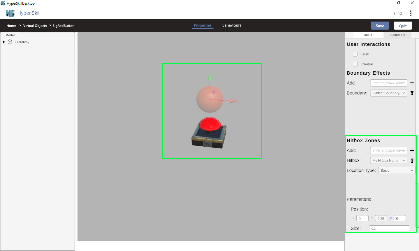 6. &#x20;Press the “+” button to create a new hitbox. The “Hitbox” dropdown will update and include your newly created hitbox. A red circle will appear, visually indicating the size and position of your hitbox. Depending on the size of your virtual object, the red circle may be inside the 3D model. You can change the size and position of the hitbox using the UI.
