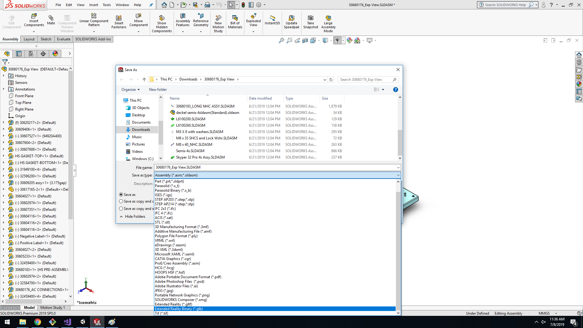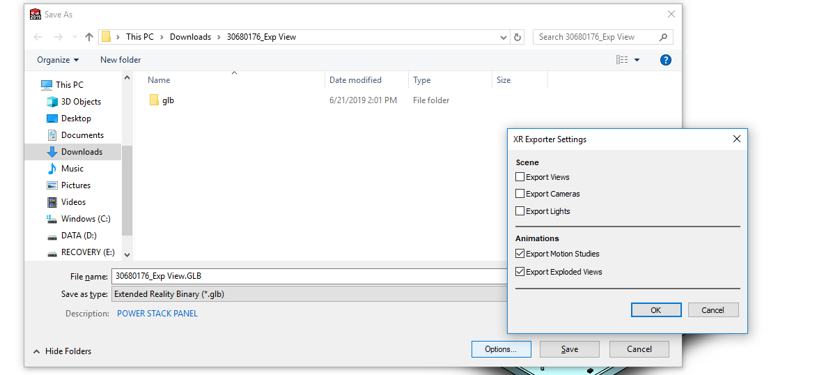 4. &#x20;Save the model and set “Save as type” to Extended Reality Binary (\*.glb)