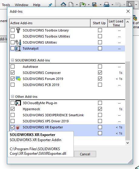 3. &#x20;Make sure SOLIDWORKS XR Exporter is checked